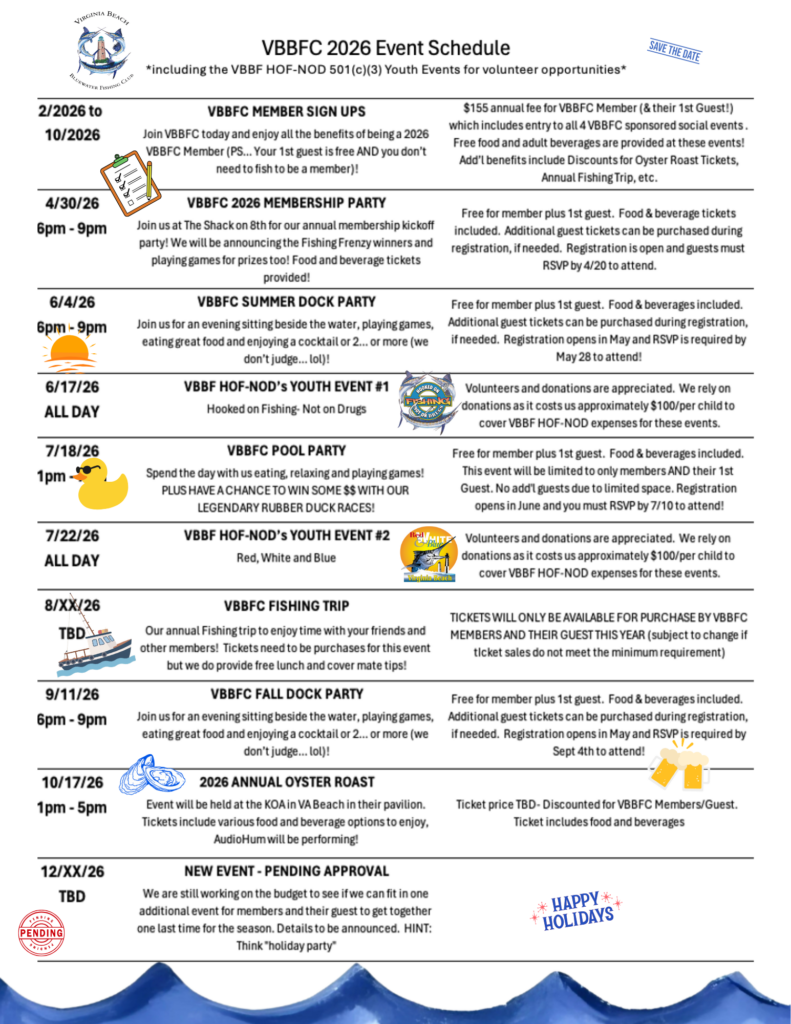 | 8/XX/26 | VBBFC MEMBER/GUEST FISHING TRIP | Registration TBA |