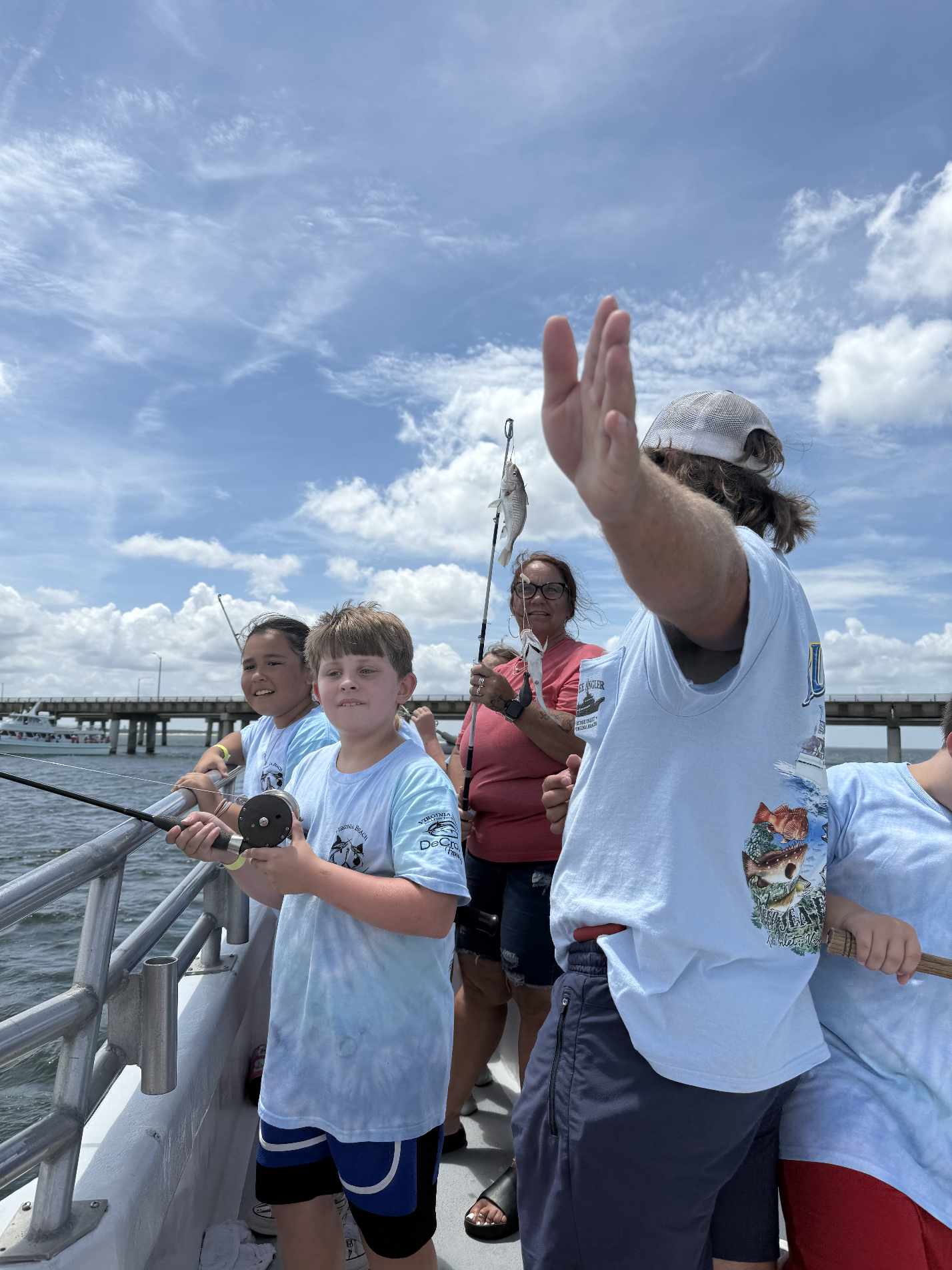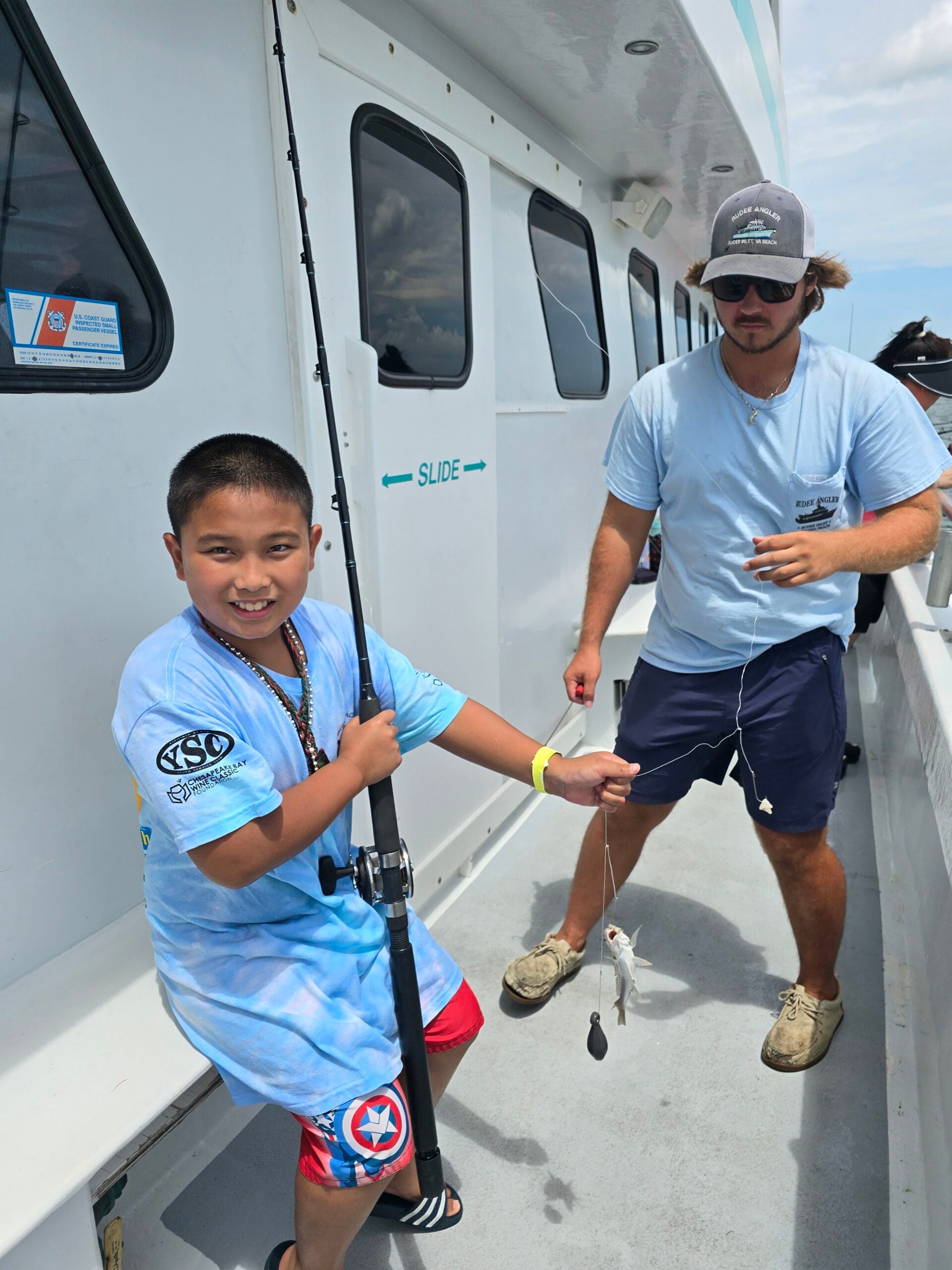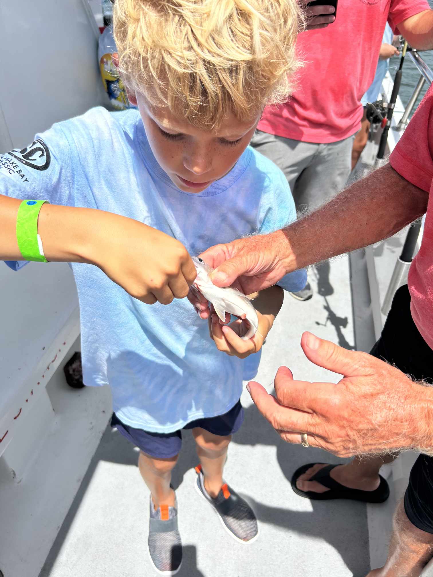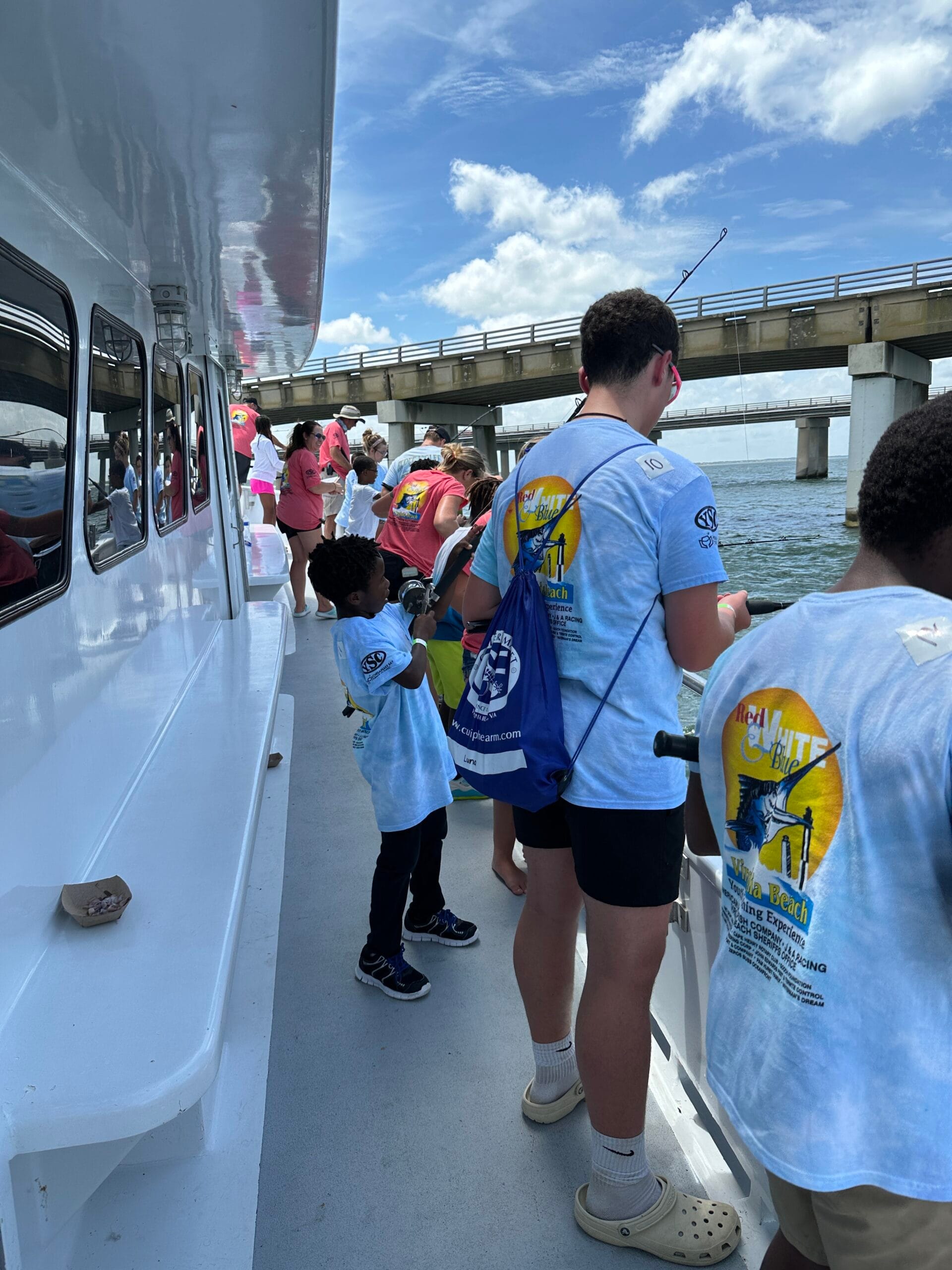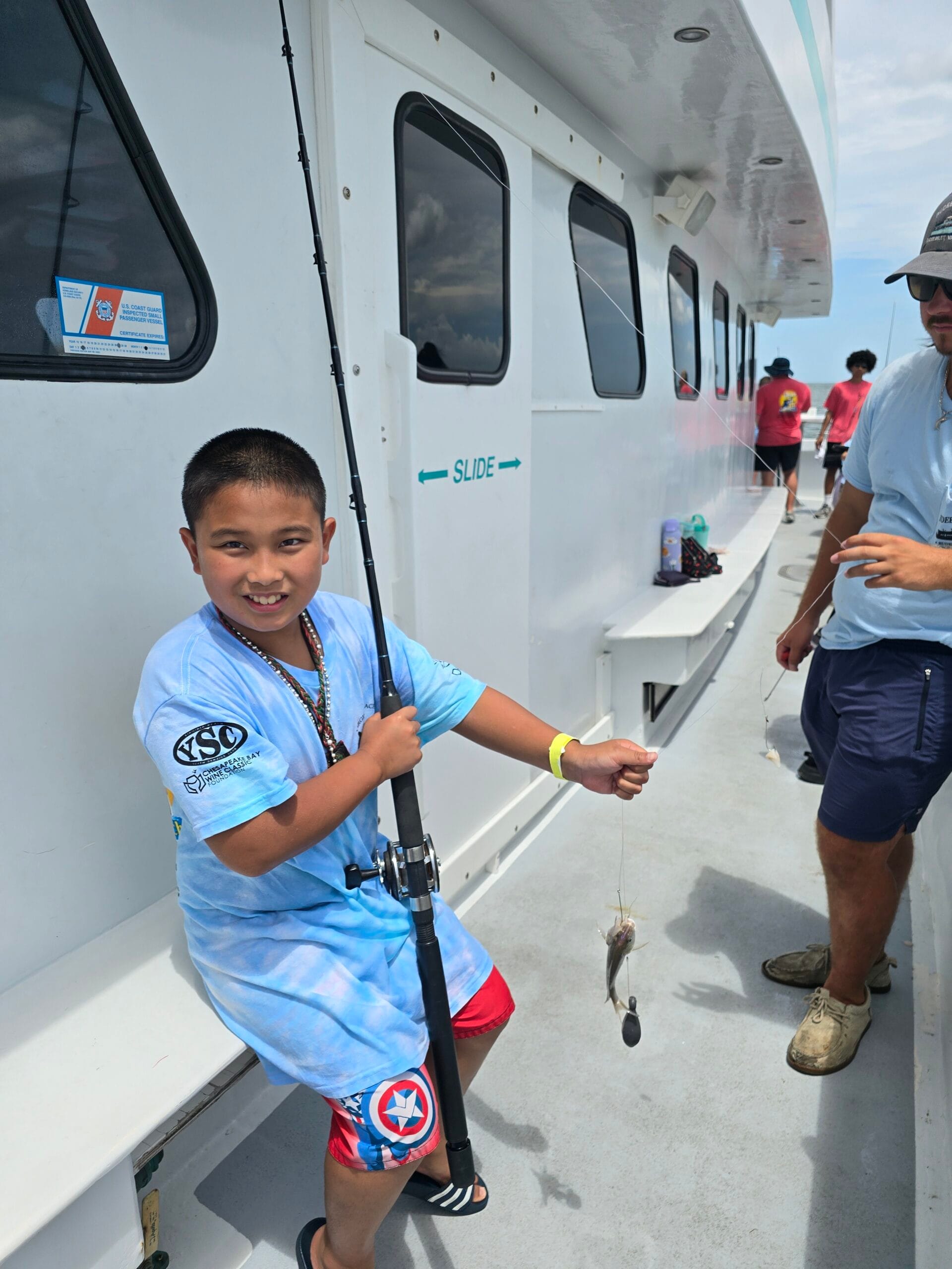 On the day of the events, the numerous volunteers are excited to welcome the kids with wrist bands and custom event shirts as their parents drop them off for the full day. Their morning consists of FUN educational presentations and multiple hands-on workshops focusing on safety, marine preservation, identification, basic fishing skills, knot-tying, etc. After enjoying their lunch, the children and volunteers are transported to 1 of the 3 Head Boats where the captain and mates are eagerly awaiting to depart to their fishing spots! The kids spend the rest of the afternoon fishing (and smiling) before returning to LETA for a meal of burgers and hot dogs. It all ends with an awards ceremony for various categories before departure.